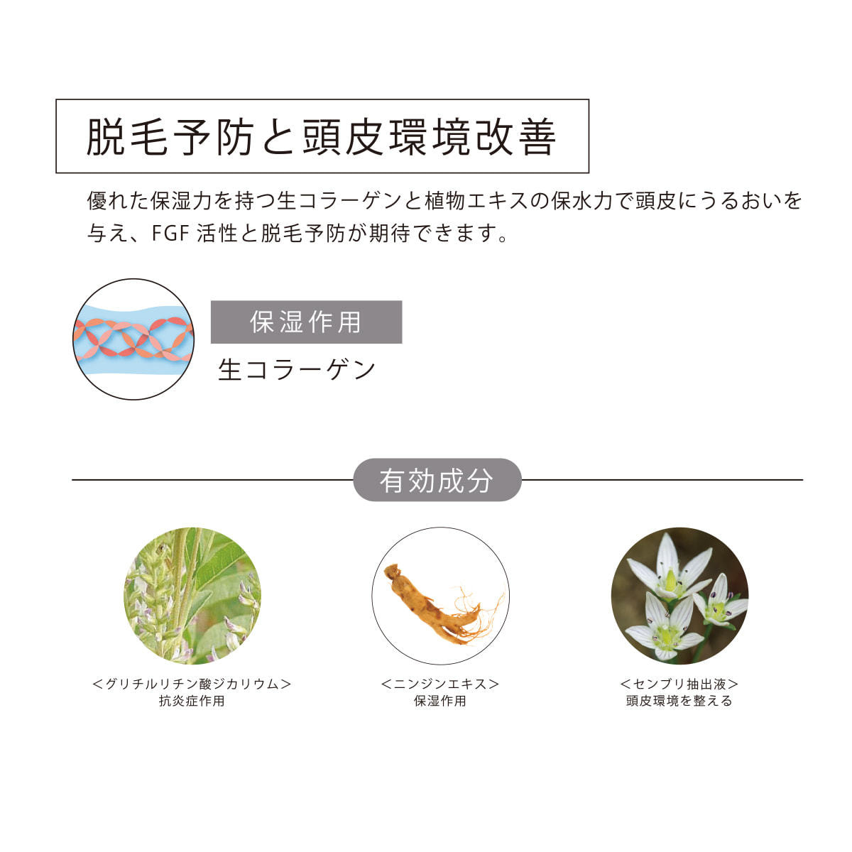 優れた保湿力を持つ生コラーゲンと、植物エキスの保水力で頭皮にうるおいを与え、FGF活性と脱毛予防が期待できます。